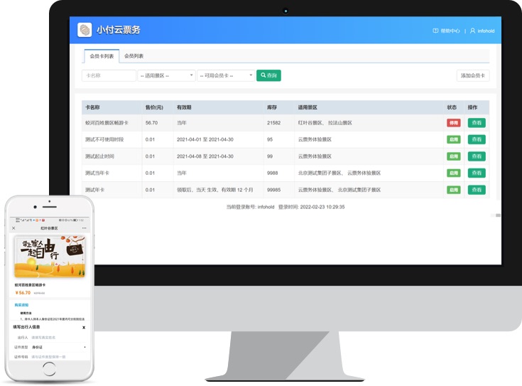 目前,拉法山和红叶谷两个景区,开展了旅游易码通业务(景区会员卡),为景区运营提供有效的系统工具。